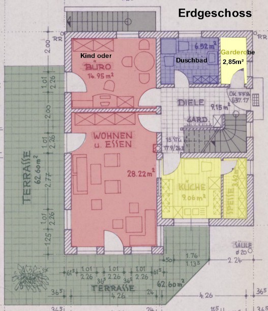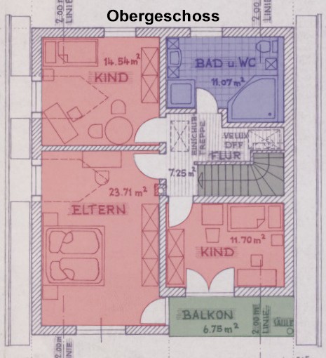 ausgelegt. Im Obergeschoss befinden sich 3 Schlafzimmer (Korkböden)